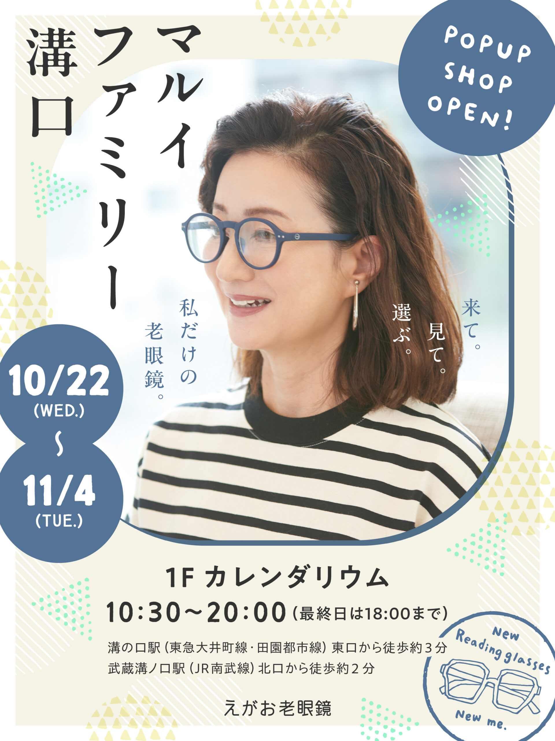 マルイファミリー溝口にて、老眼鏡のセレクトショップ『えがお老眼鏡』のPOP UPショップをオープンいたします。