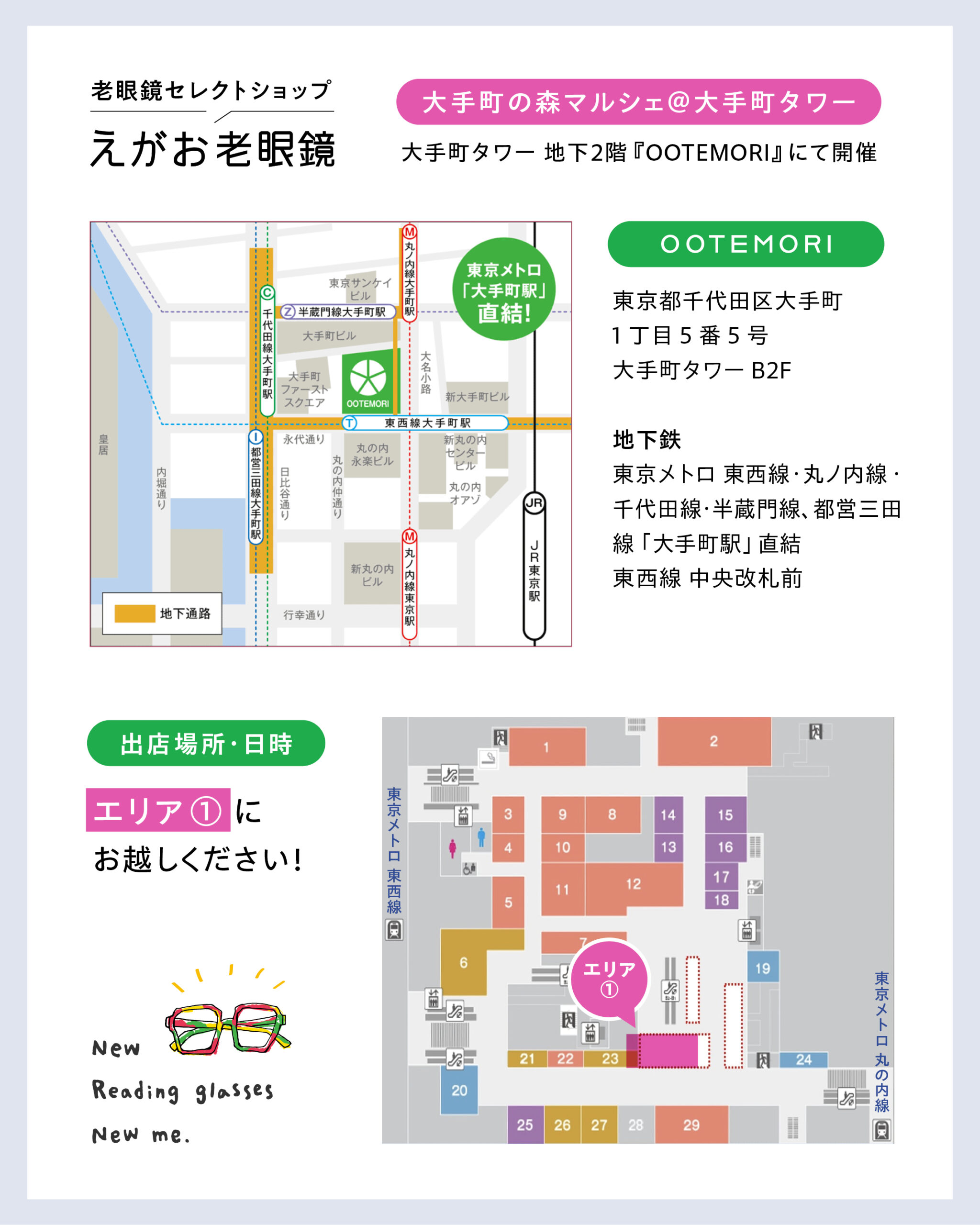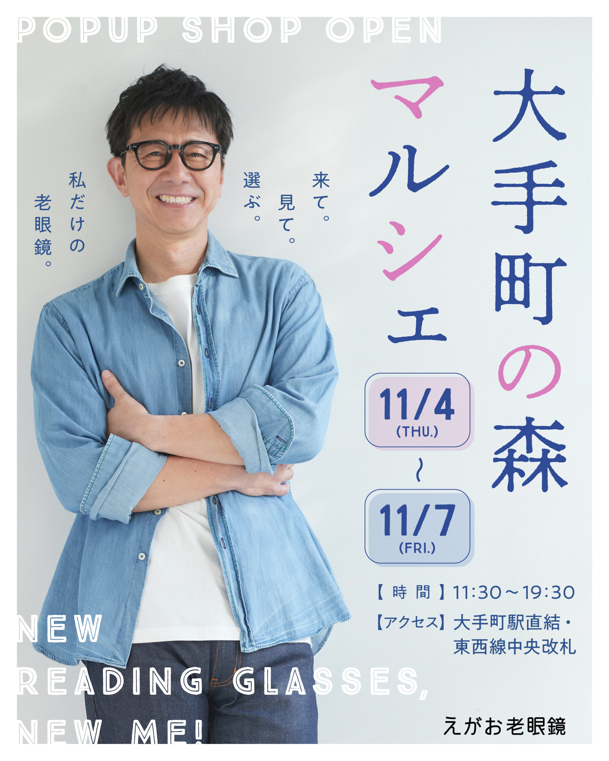 大手町の森マルシェにて、老眼鏡のセレクトショップ『えがお老眼鏡』のPOP UPショップをオープンいたします。