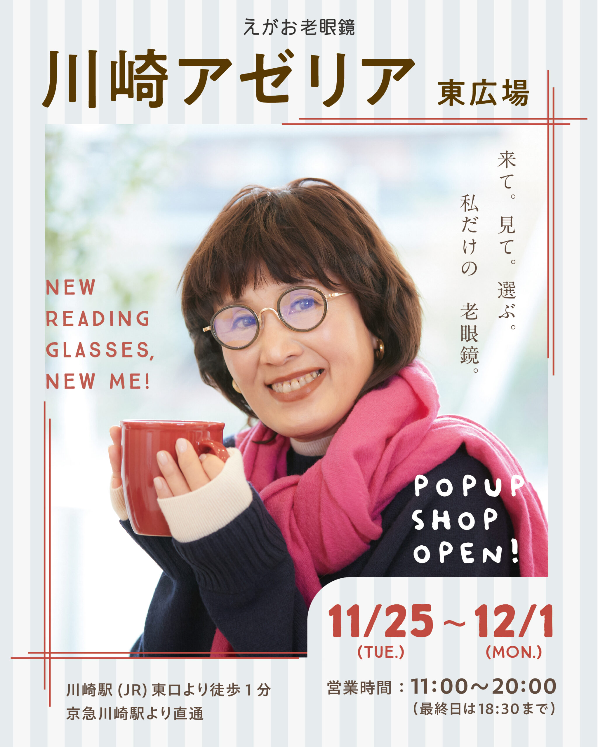 川崎アゼリア 東広場にて、老眼鏡のセレクトショップ『えがお老眼鏡』のPOP UPショップをオープンいたします。
